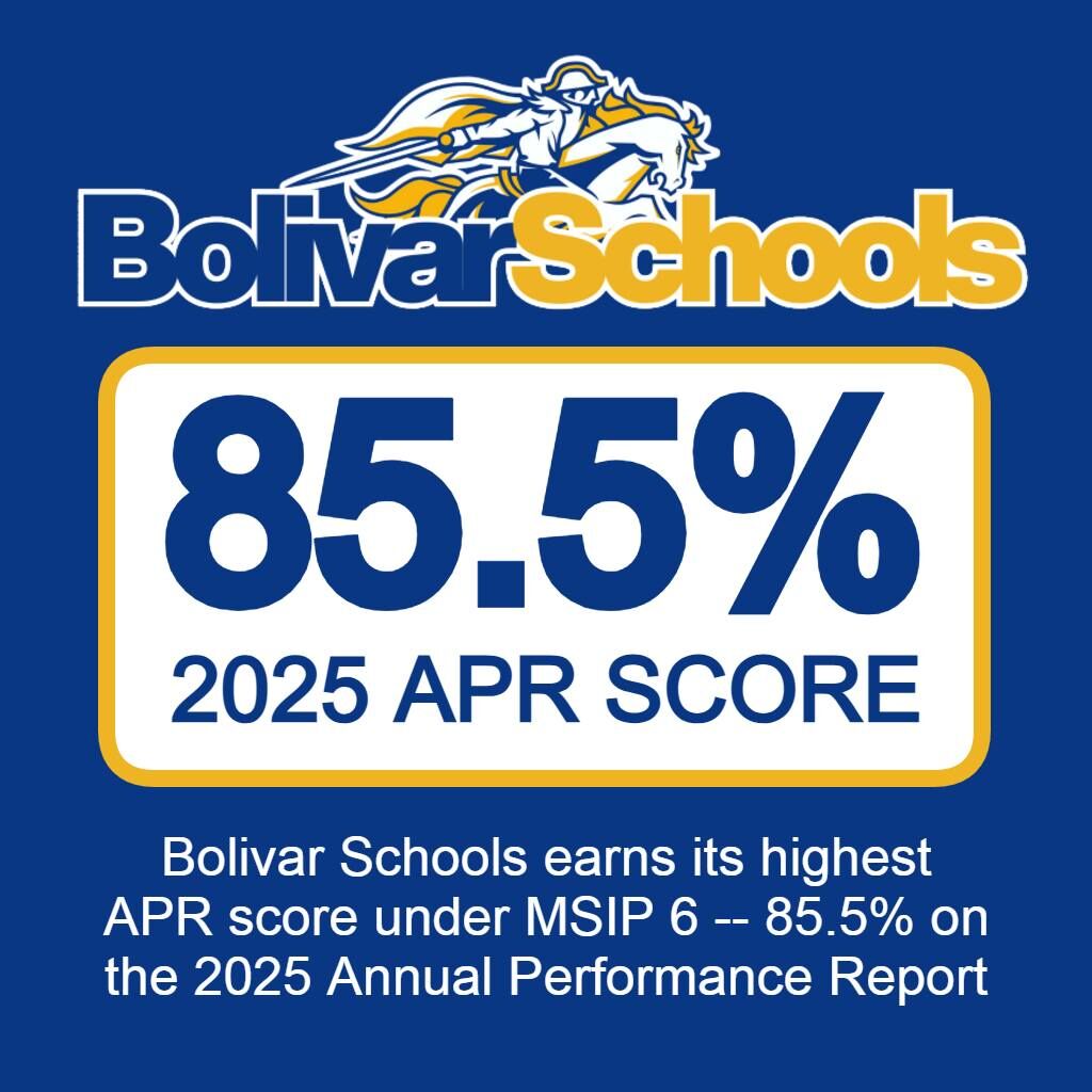 Highest APR Score under MSIP 6 Bolivar Schools is excited to share the results of its Annual Performance Report from the 2024-2025 school year! We earned an 85.5% APR score, the highest we have received since MSIP6 began. Congratulations to all of our students, teachers, support staff, and administrators! This is a huge accomplishment for our Liberators!