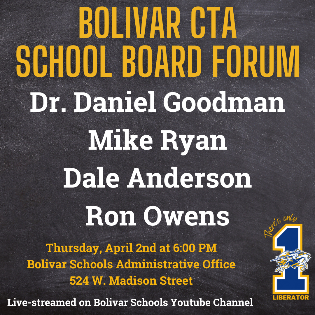The Bolivar CTA School Board Forum is on Thursday, April 2nd, at 6:00 PM at the Bolivar Schools Administrative Office. There are three open seats up for election. The forum will be live-streamed on the Bolivar Schools YouTube Channel.