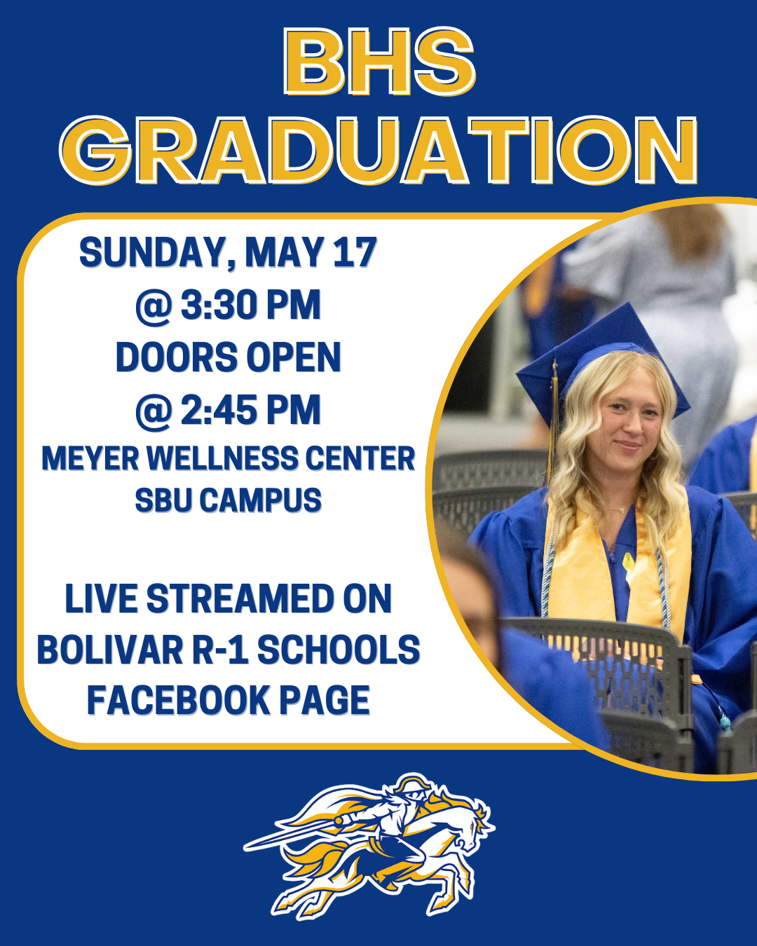 The BHS graduation will take place on Sunday, May 17th, at 3:30 PM at Meyer Wellness Center on the campus of Southwest Baptist University. The ceremony will be live-streamed on the Bolivar R-1 Schools Facebook page.BHS Seniors Embark on 74th Annual Senior Trip
