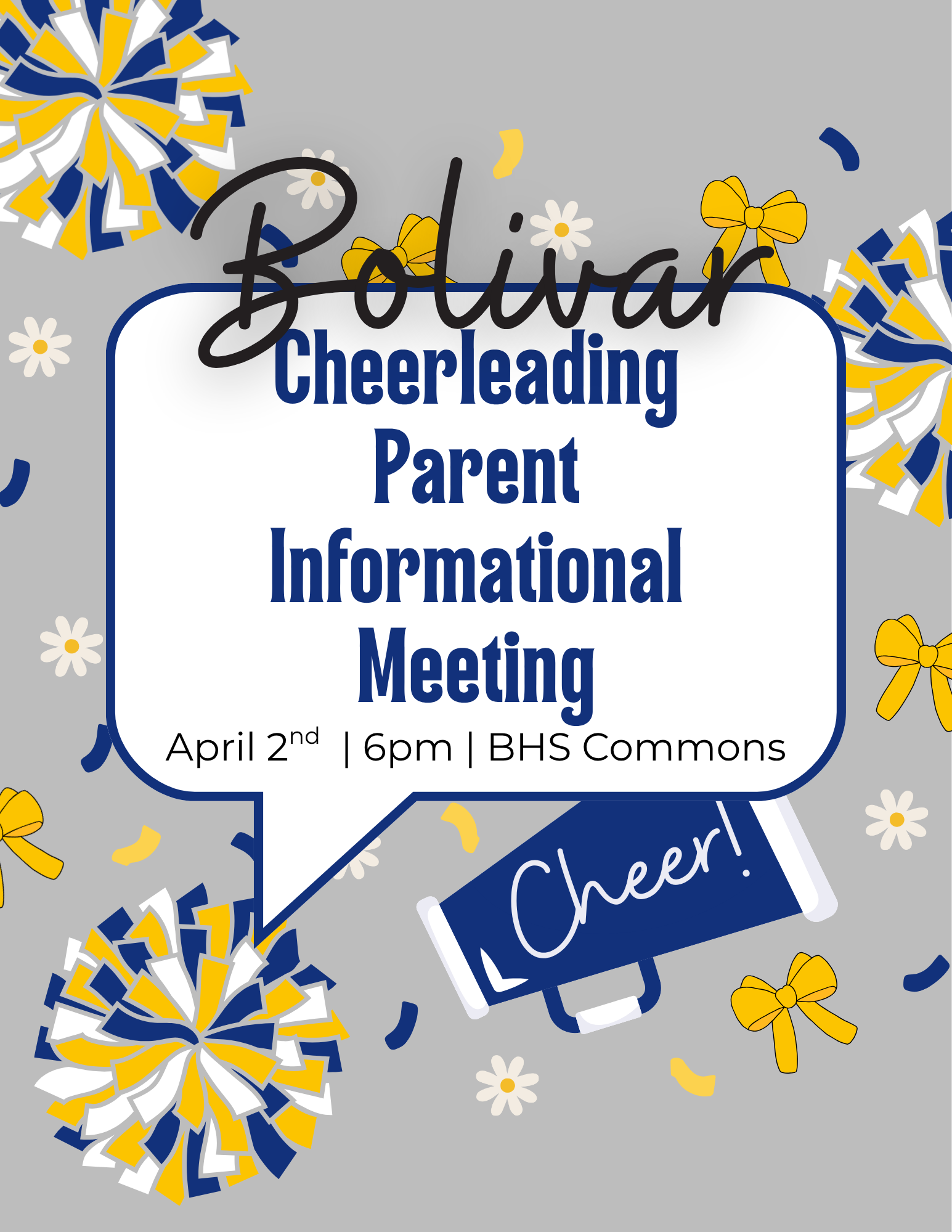 If you are interested in trying out for the BHS/BMS cheerleading team for the 2026-2027 school year, please join us for the parent informational meeting on April 2nd at 6:00 PM in the BHS commons.