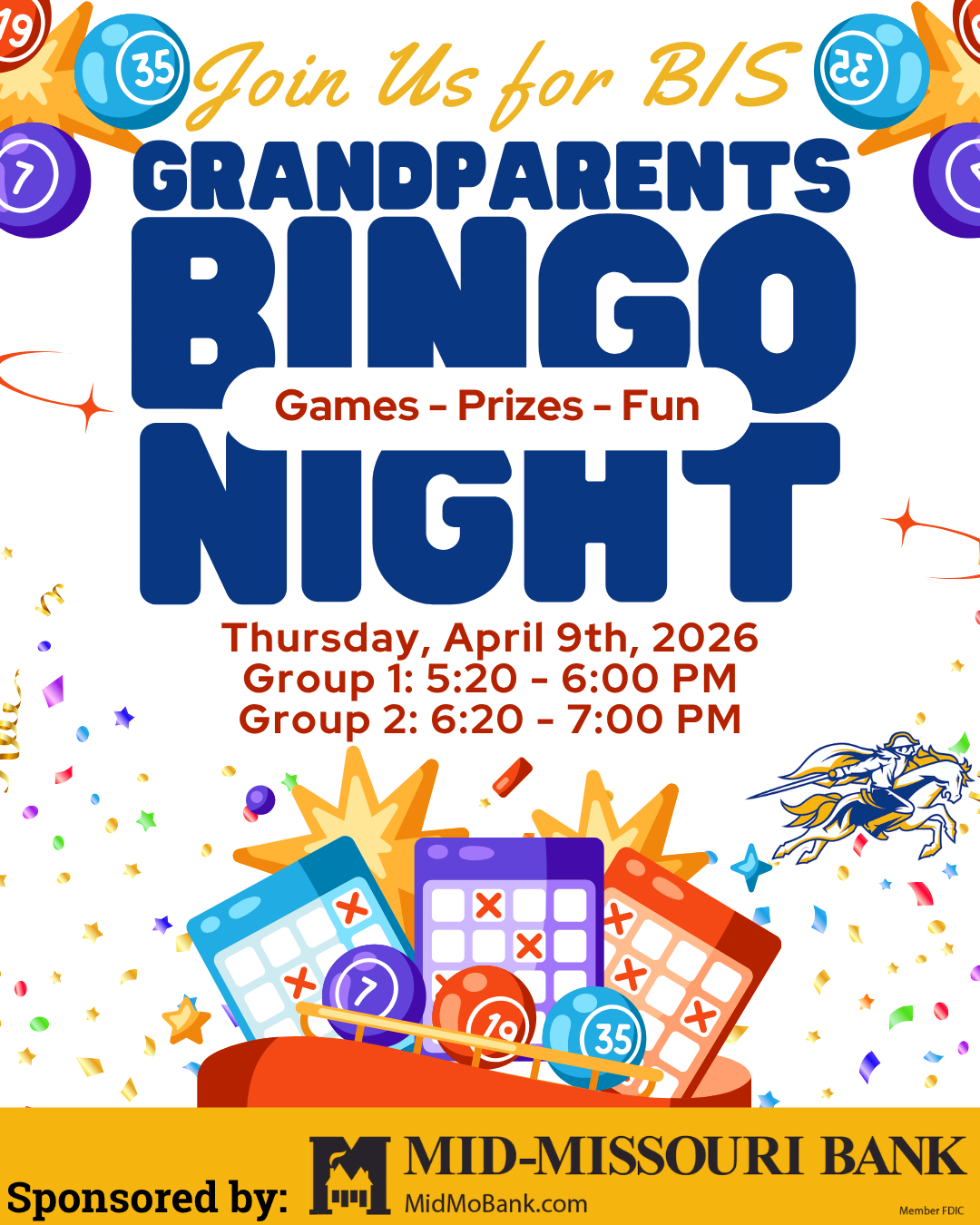 BIS Grandparents Bingo Night is coming up on Thursday, April 9th! To sign up, follow the link below. Thank you to Mid-Missouri Bank for sponsoring the event!